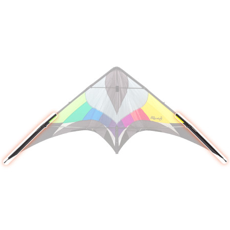 De leading edge van deze vlieger is in twee delen gesplitst, een boven- en een onderstuk. Dit zorgt voor een compactere verpakking. De stangen van de leading edge lopen extern tussen de neus en de vleugeltips van de vlieger. Alle componenten zijn volledig gemonteerd. Gedetailleerde technische informatie vindt u in de productinformatie.